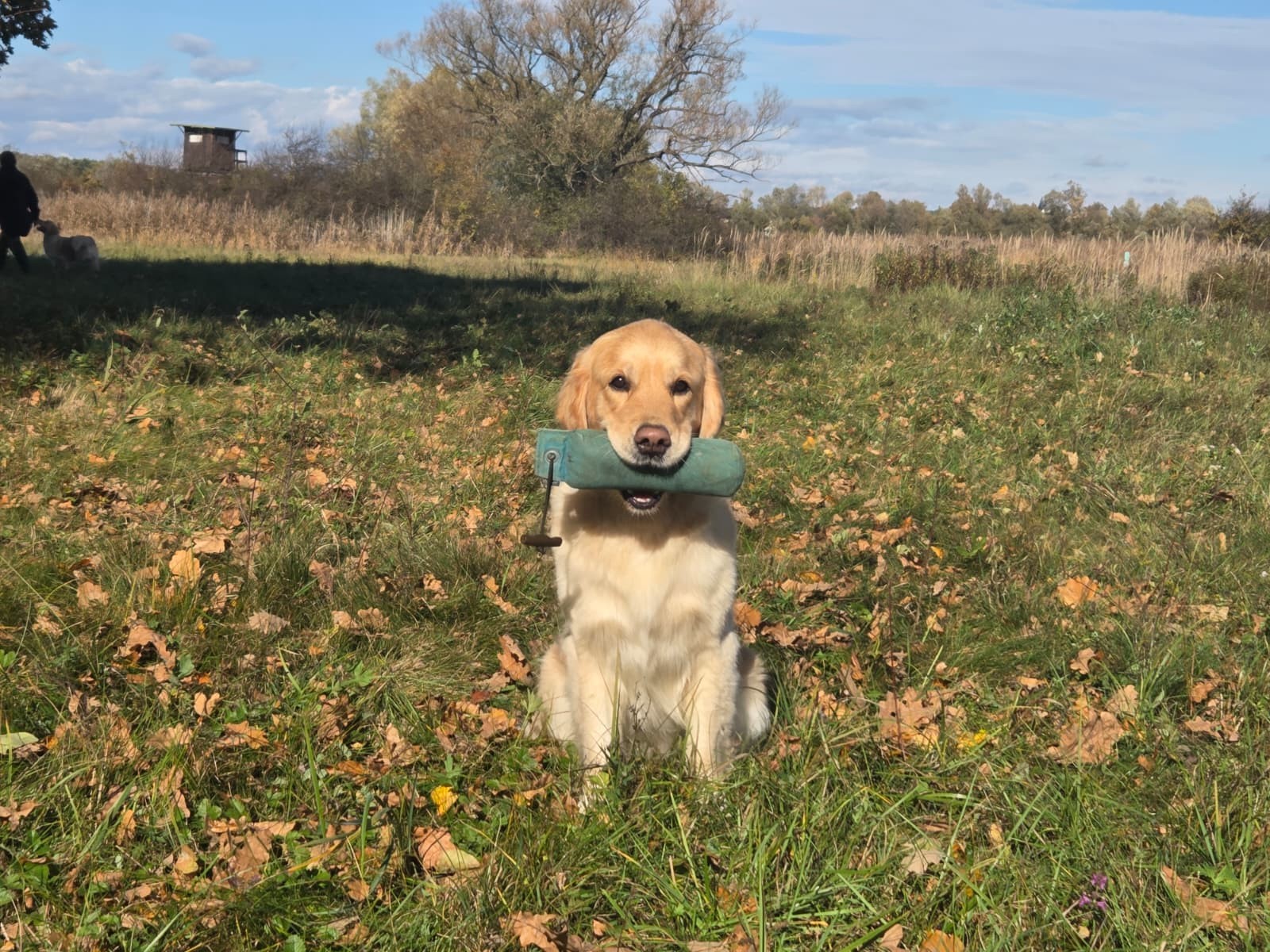 Station 3 (Herwig Deutinger): Es waren 3 Dummies bei einer Baumgruppe mit Bewuchs versteckt - die Helferin hat auch geschossen. Ich weiß jetzt gar nicht mehr, ob da auch eine Fußübung war. Jedenfalls hat Maze beide Dummies gefunden und gebracht. Eines ist ihr leider aus dem Maul gerutscht - sie hat eh gleich nachgegriffen. Aber somit hatten wir gleich den ersten Nuller.
