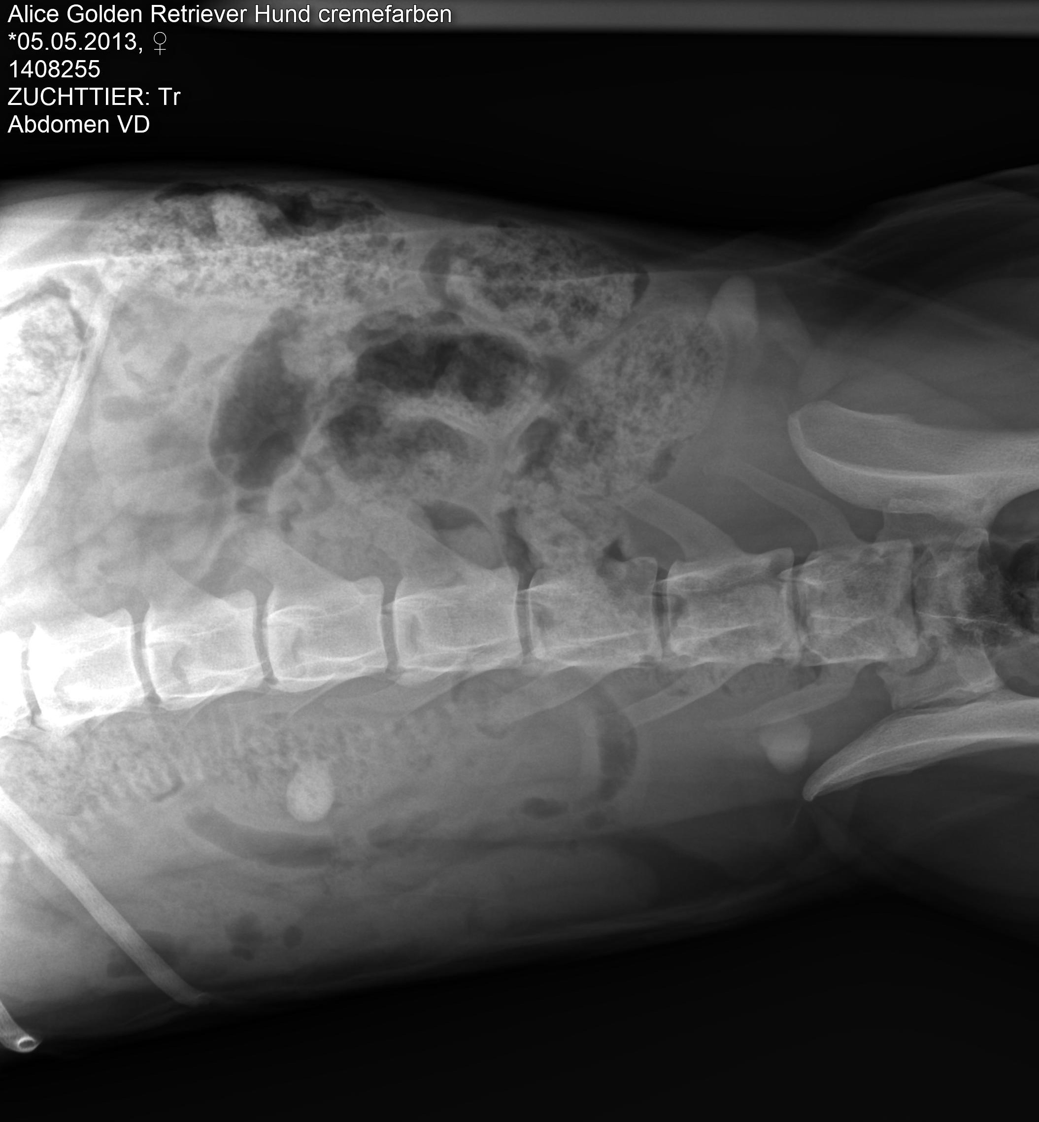 Wie es im Moment ausschaut, nimmt Alice nicht so zu, wie es bei den vorhergehenden Trächtigkeiten zu dem Zeitpunkt war. Wir müssen also wohl eher mit einem kleineren Wurf rechnen. Ich habe auch zwei Ultraschallversuche gemacht. Beim ersten Tierarzt hat das Ultraschallgerät nach dem ersten Welpen seinen Geist aufgegeben, beim zweiten gestern wollte die Tierärztin nach zwei Welpen nicht weitersuchen, weil ihr die Haare im Weg waren. Also zwei sind's einmal sicher - wir hoffen aber schon auf etwas mehr. Vielleicht überrascht Madame uns auch noch. Es geht ihr auf jeden Fall gut.